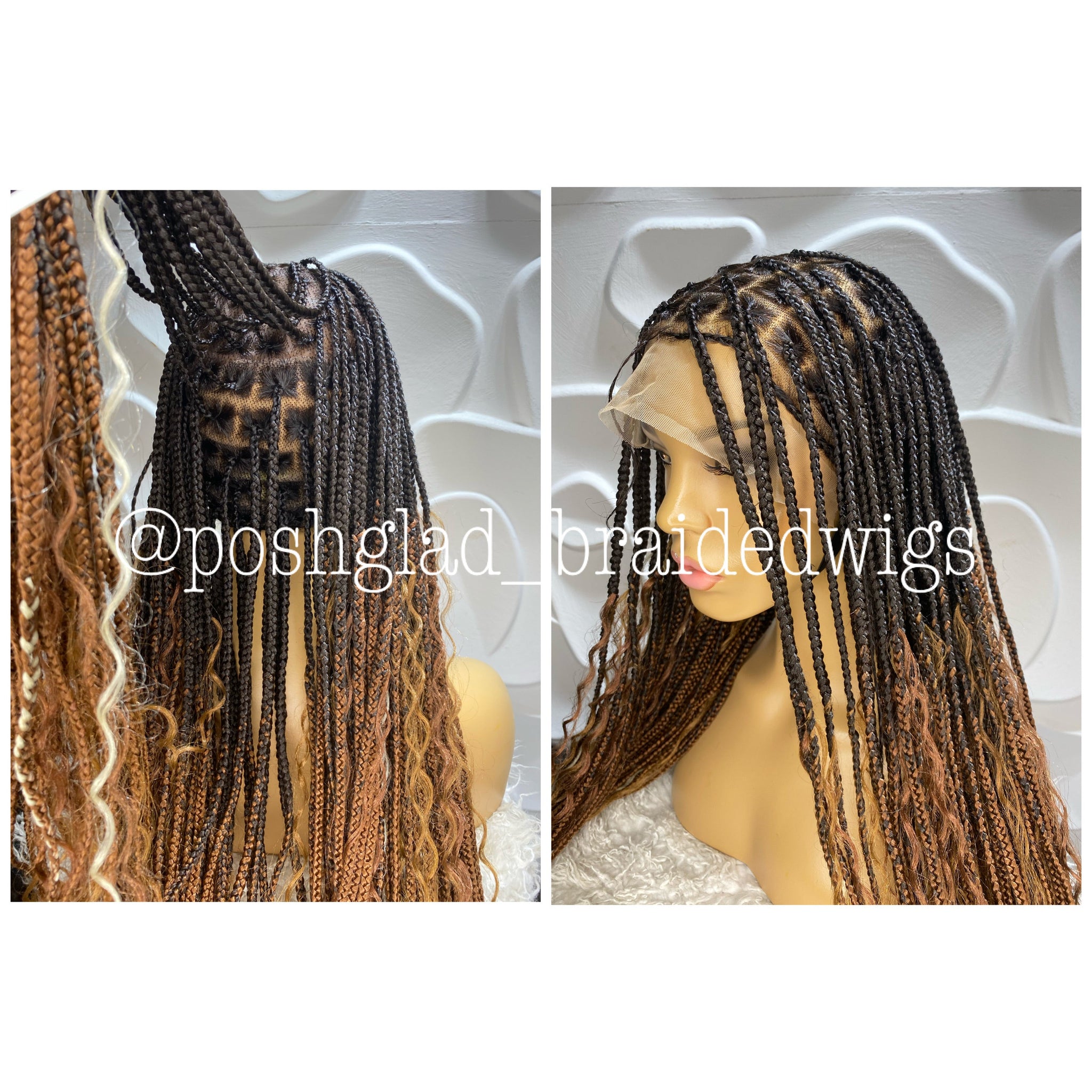 This scalp-looking glueless goddess knotless braid wig is completely customizable and can be adjusted to fit any head size. Made with 100% human hair up to "8-12", a stretchable Premium Swiss Full Lace, Ombre color, and a fine blend of curly kanekalon fiber for extra length. The wig comes with 2-4 combs, an internal rubber band in black, an adjustable snap-strap, and soft baby hair. It weighs approximately 0.50 - 0.70g and is perfect for anyone looking for a stylish and comfortable wig.