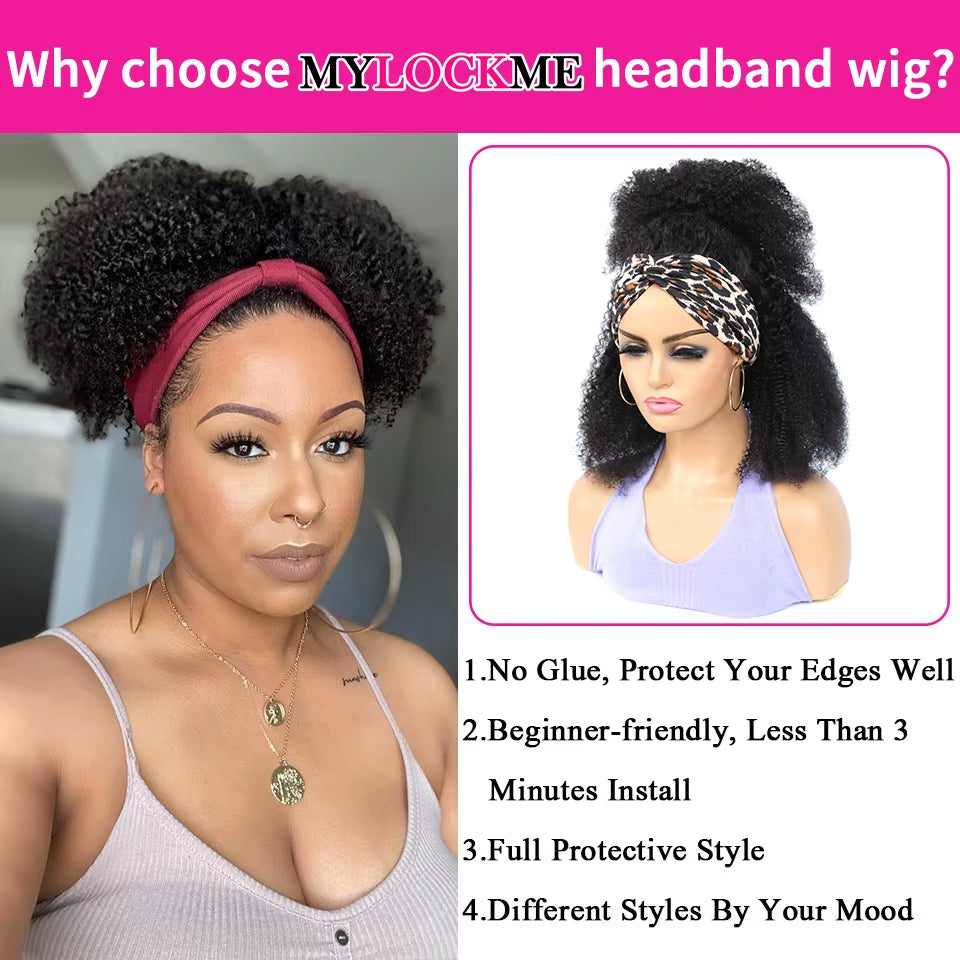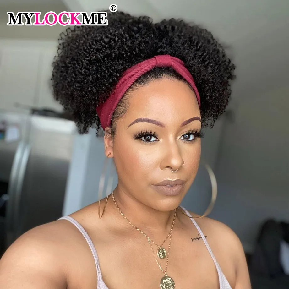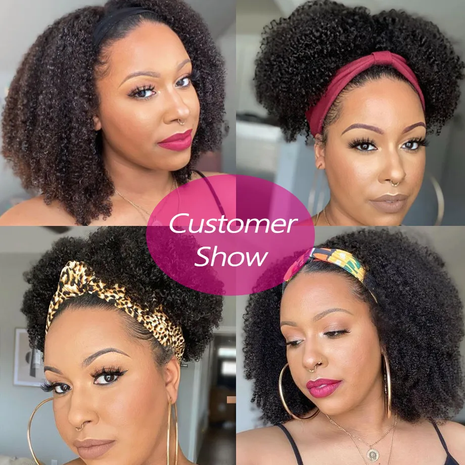 Afro Kinky Curly Half Wig Human Hair With Headband Brazilian Remy Hair Machine Made Wig, Natural Color - 200% High Density