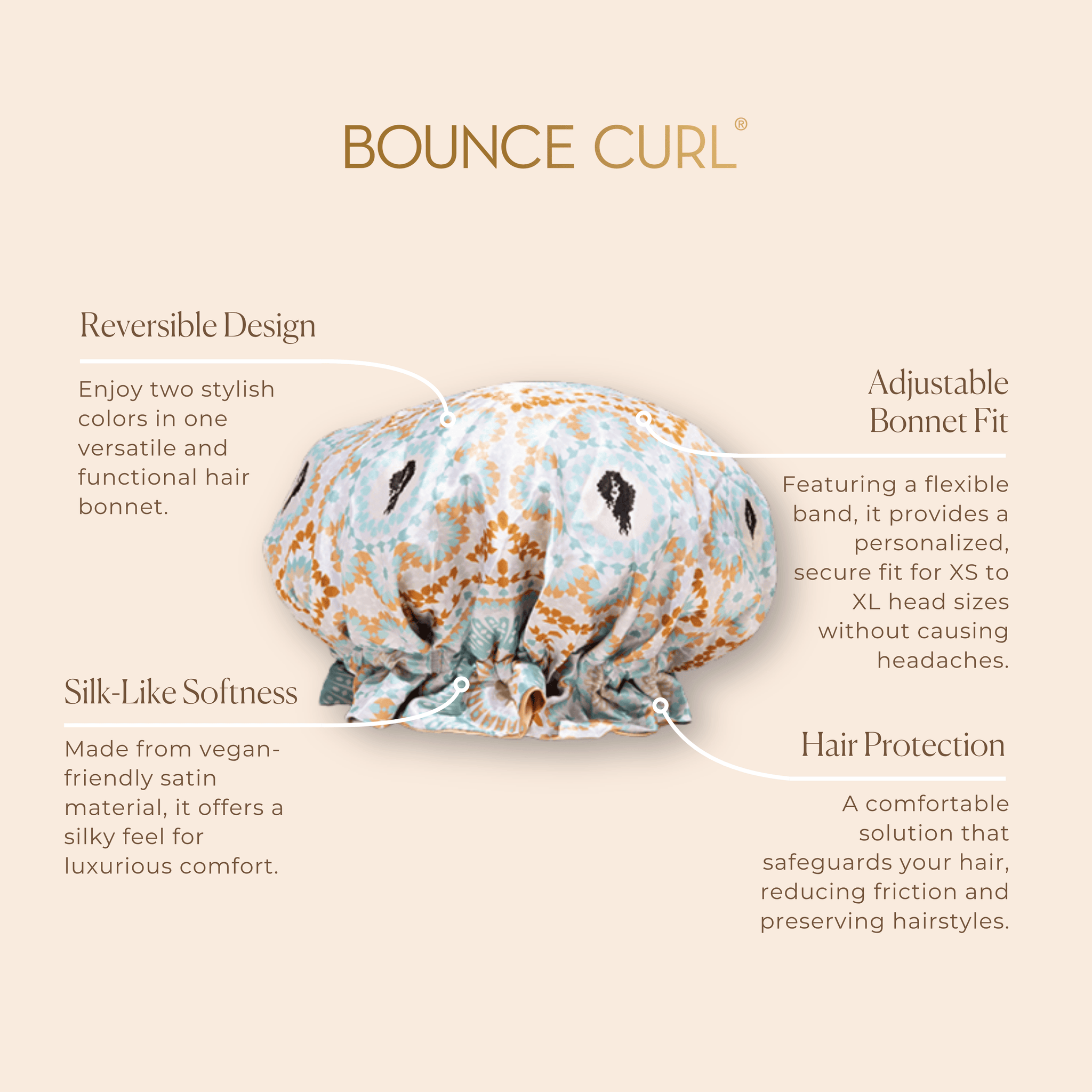 Bounce Curl Reversible Satin Hair Bonnet offers luxurious hair protection with its silk-like vegan material. Designed to reduce friction and preserve hairstyles, it features an adjustable band for a comfortable, custom fit. Suitable for wavy, curly, and coily hair types, it leaves your hair feeling smooth, frizz-free, and beautifully cared for.