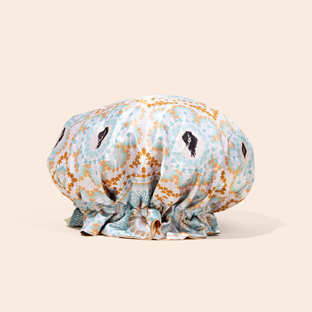 Gather your hair into a loose ponytail, gently place the Bounce Curl Satin Adjustable Hair Bonnet over your hair, and secure it comfortably. Adjust the band to fit your head.